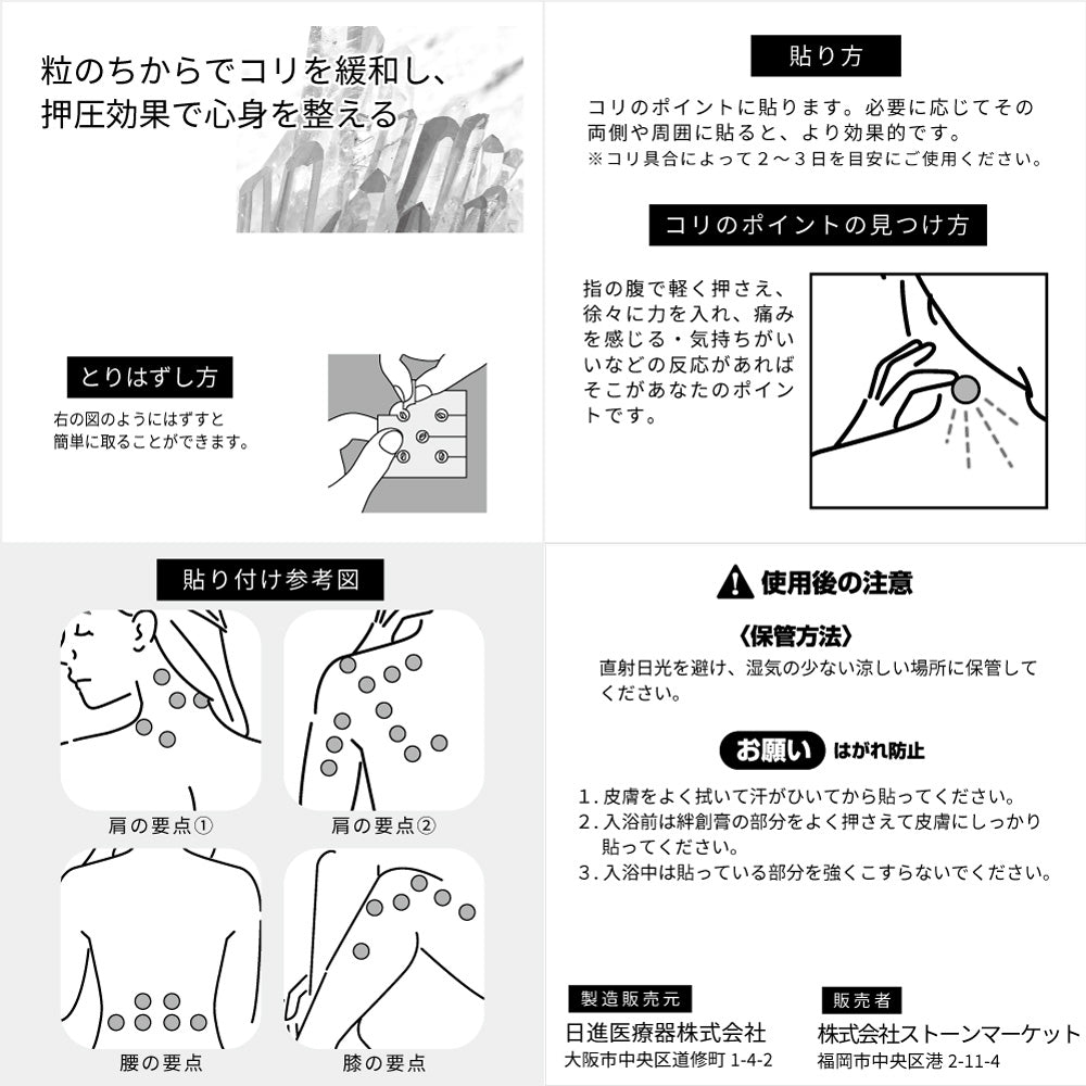 眼の疲れや首や肩まわりのコリやストレスを軽減させる貼るだけのエステ!水晶がツボを押し、押圧効果で足のむくみや冷え性緩和にも!気分も上がり健康にも良く、かわいいパッケージの政府公認の一般医療機器です。プレゼントにもおすすめです。