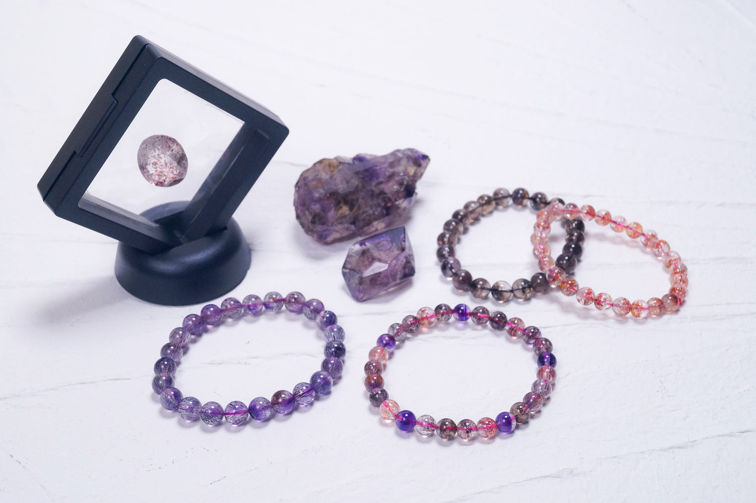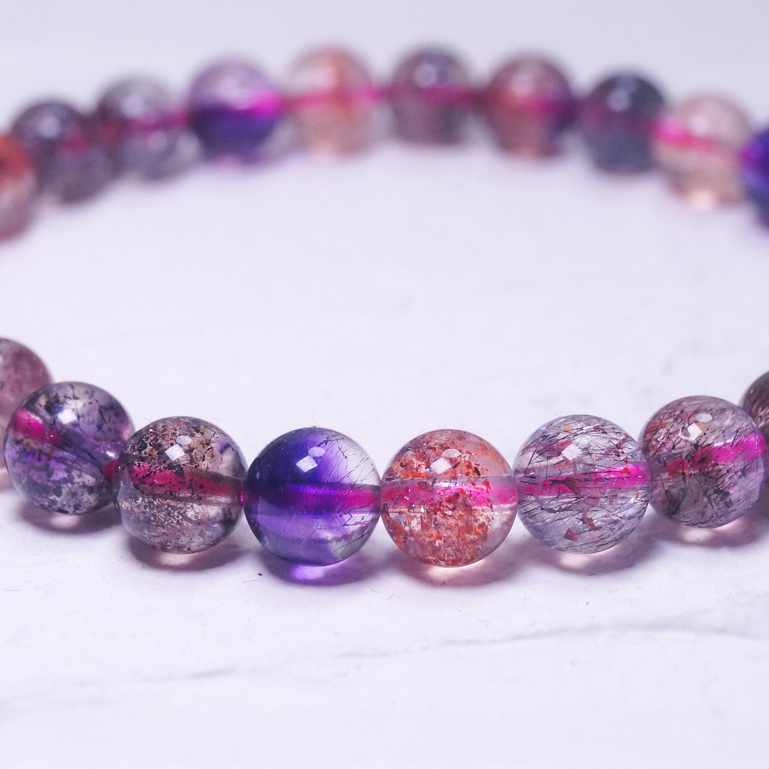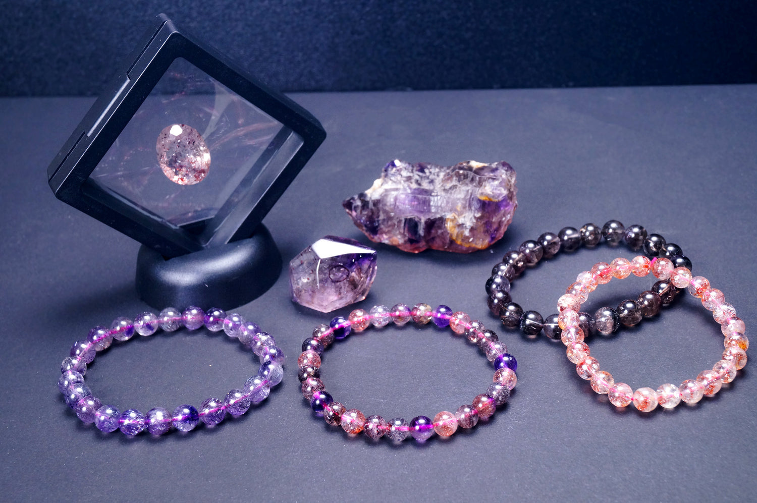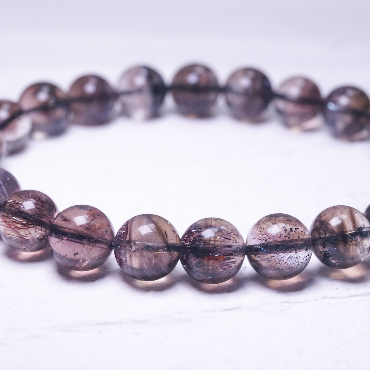 内包物の量・水晶の透明感ともに5Aにふさわしい佇まいを備えたブレス。1本で様々な表情を楽しめるマルチスーパーセブンです。