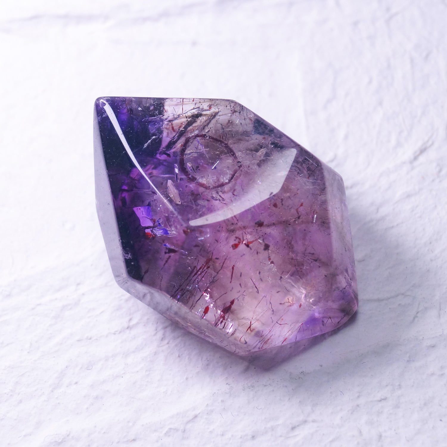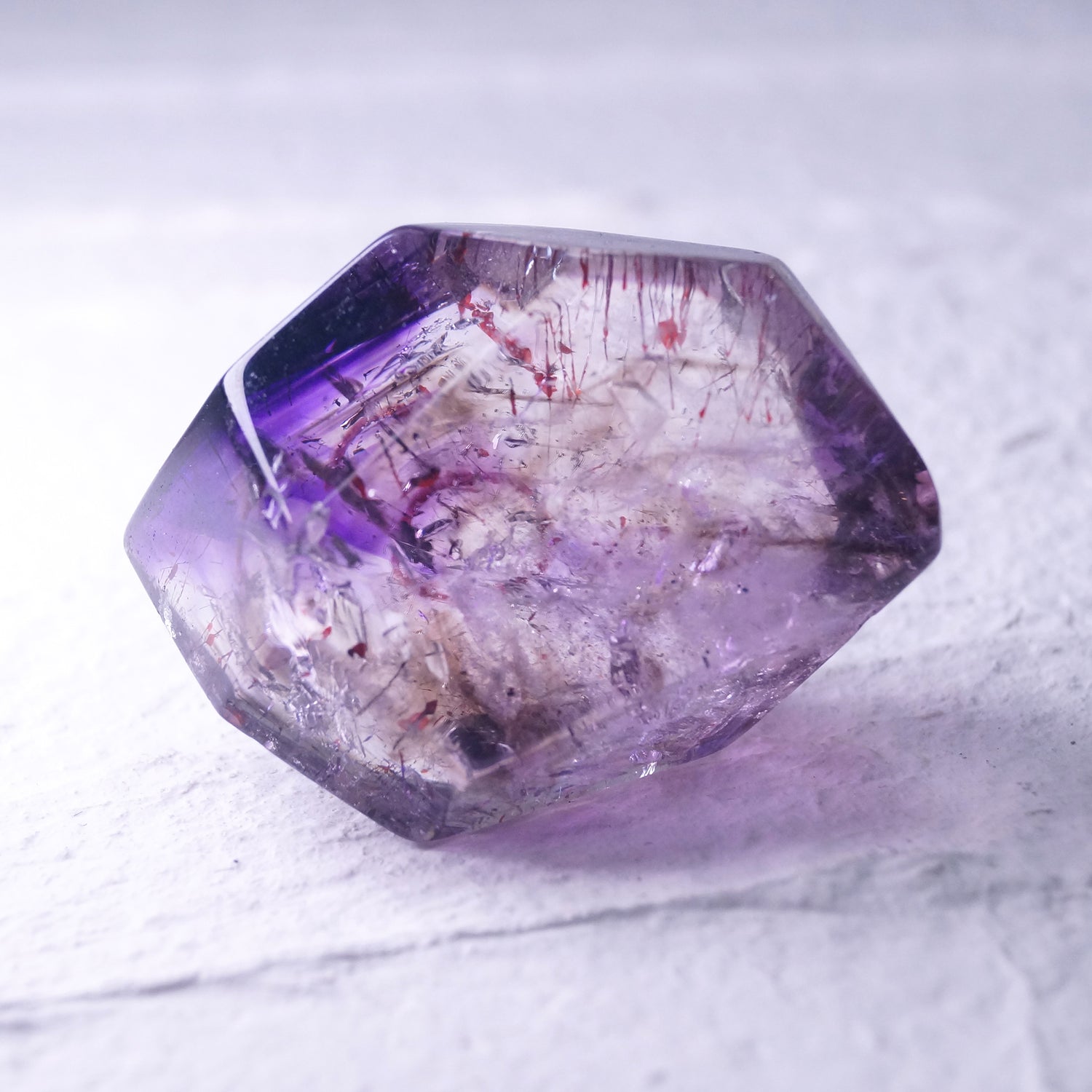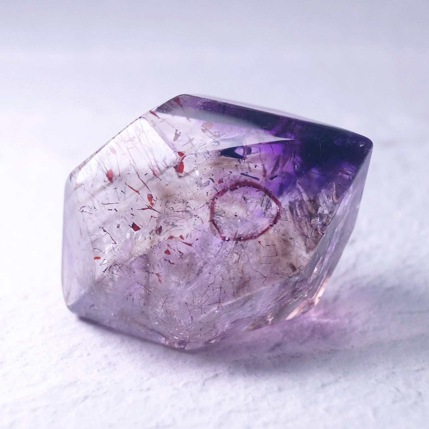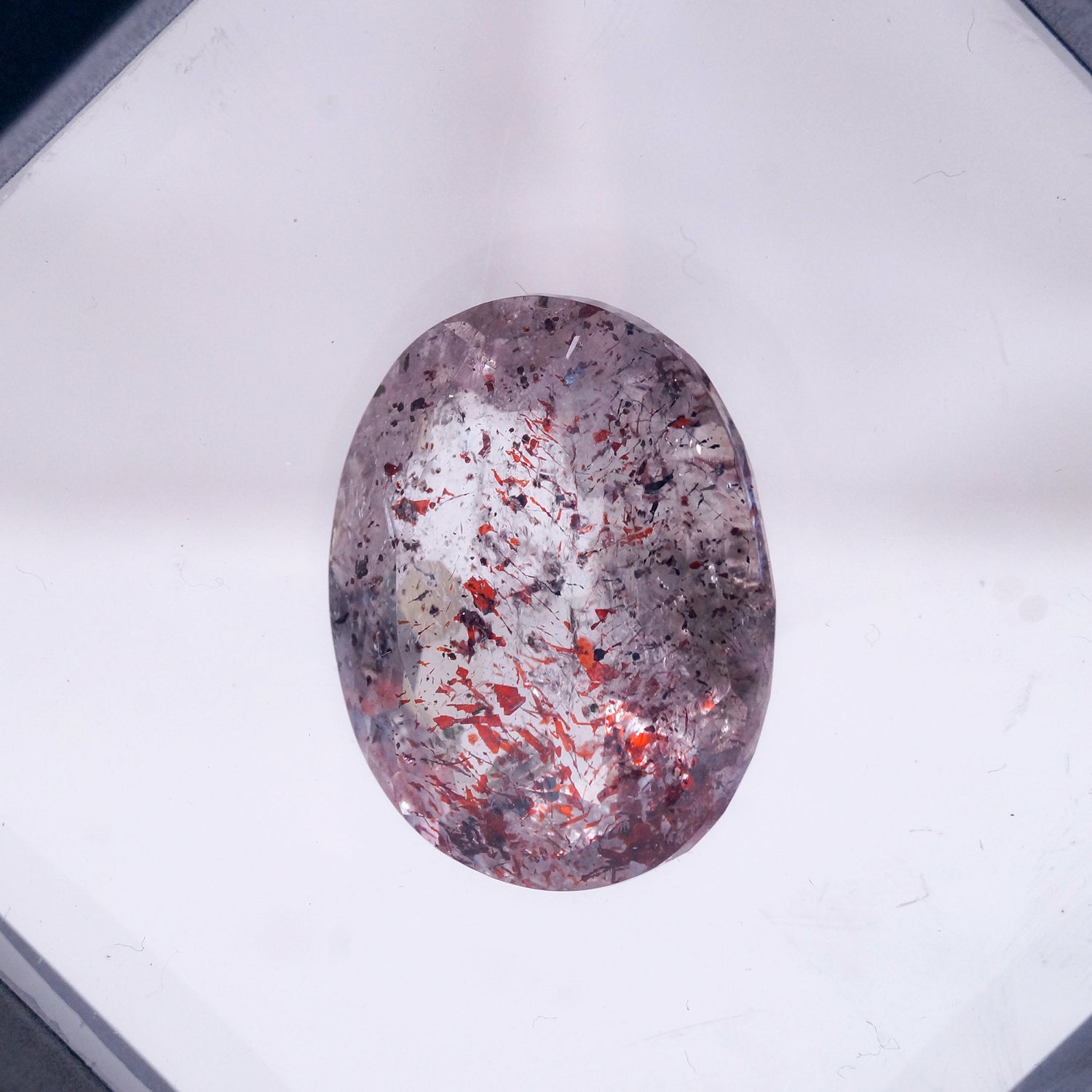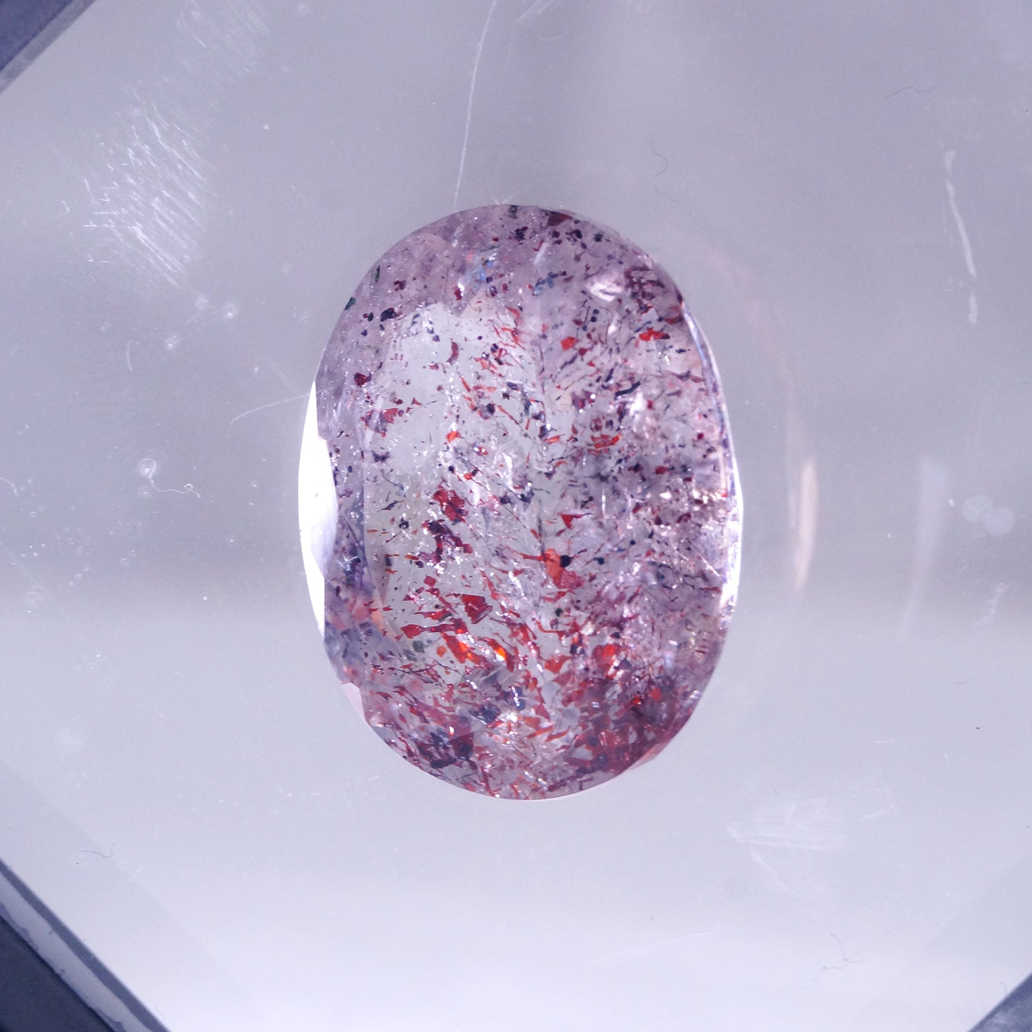 濃いめのレッドとブラックが針状・葉片状に散らばり、ファセットとともに煌めいています。スーパーセブンの良さを宝石としてコレクションいただけます。