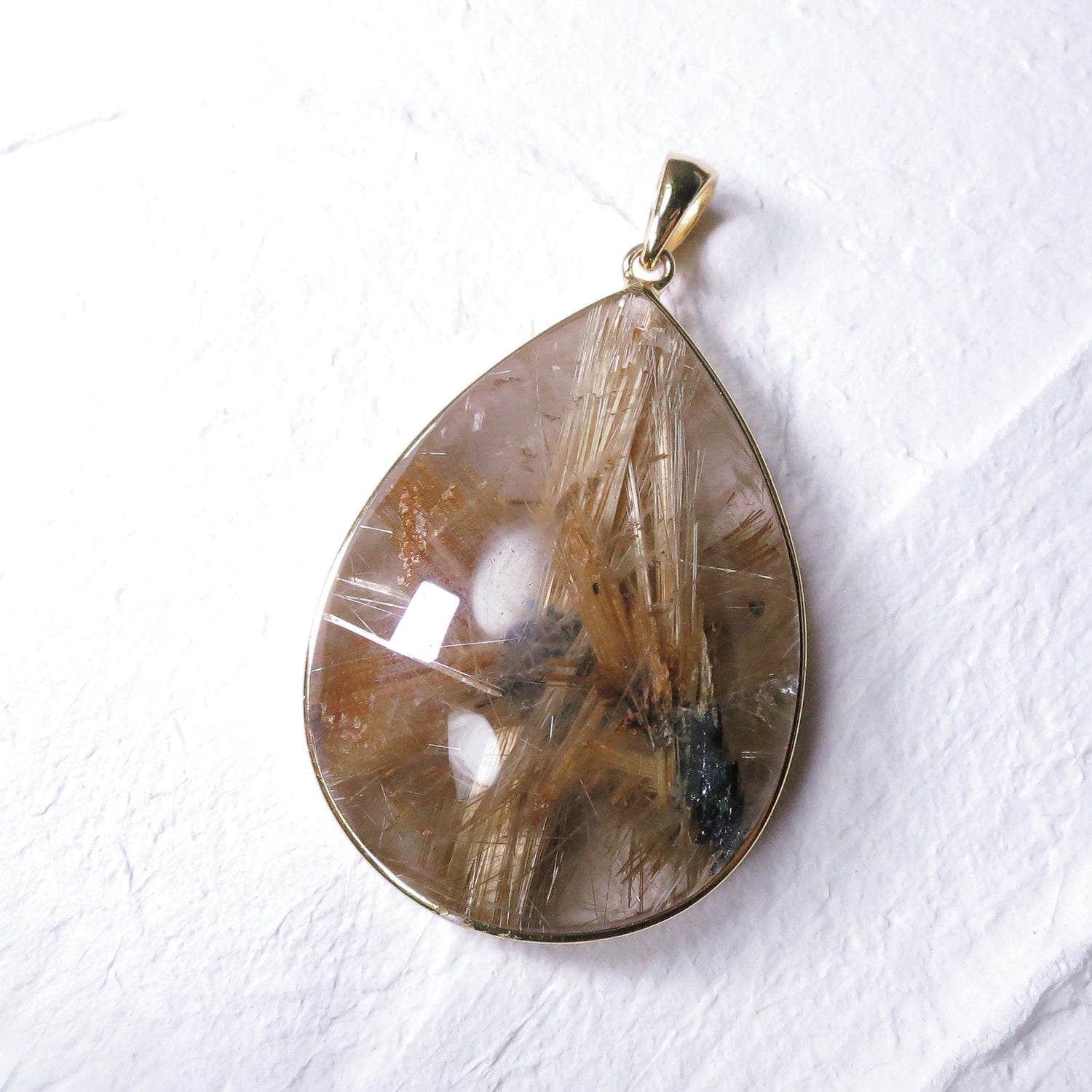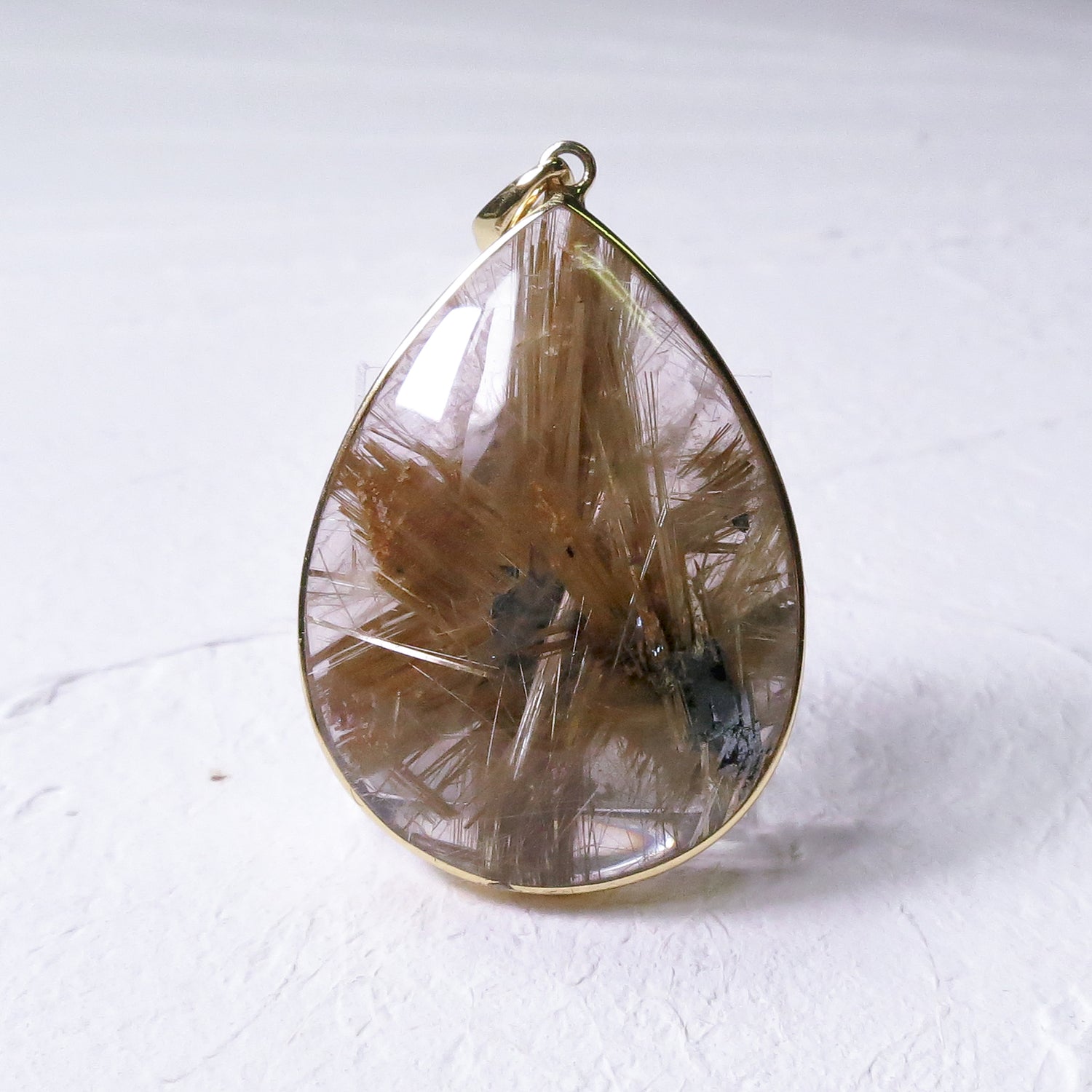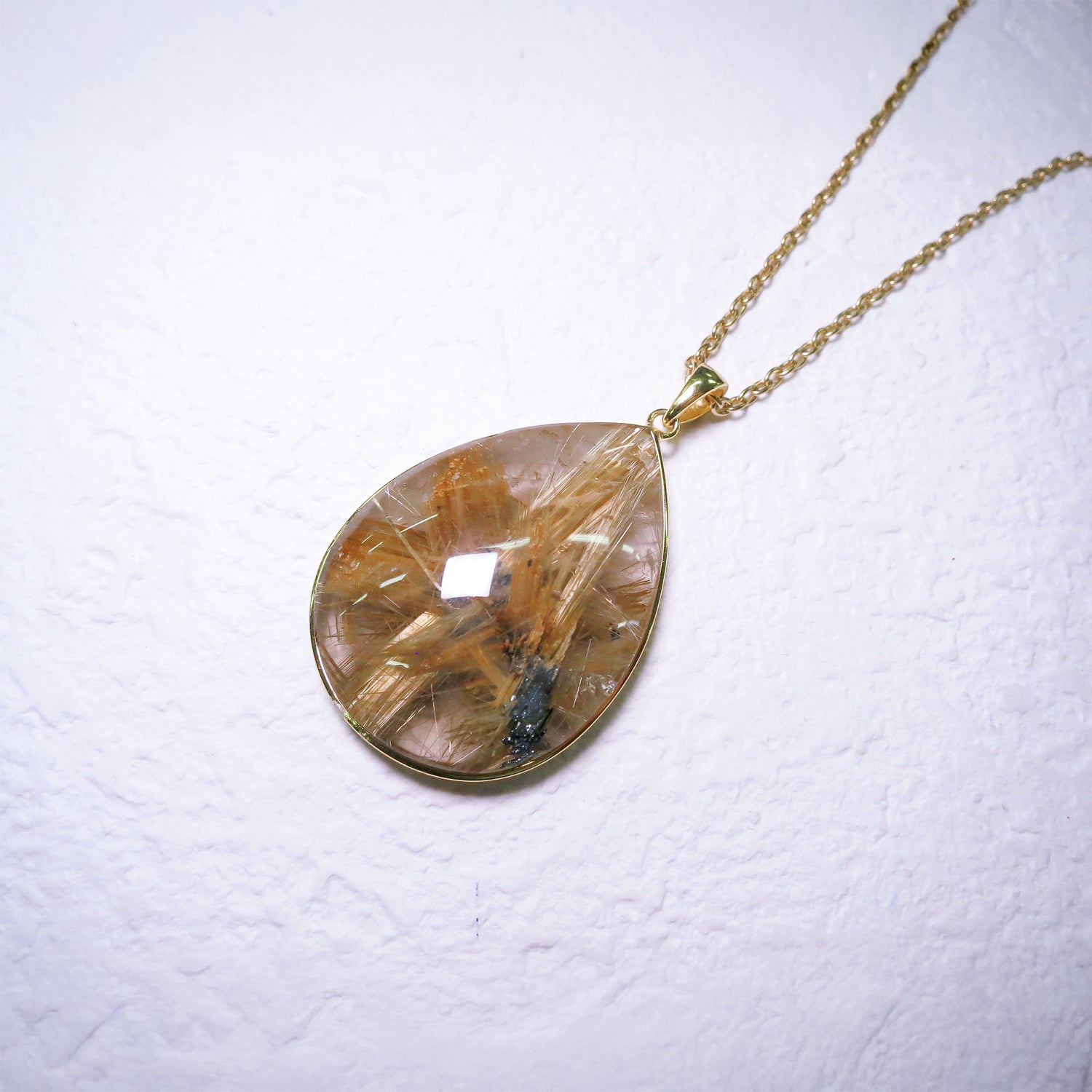 大振りのペアシェイプカットに太陽放射ルチルが2つも入っており、まさに”沈まない太陽=成功が続く”を表しています。