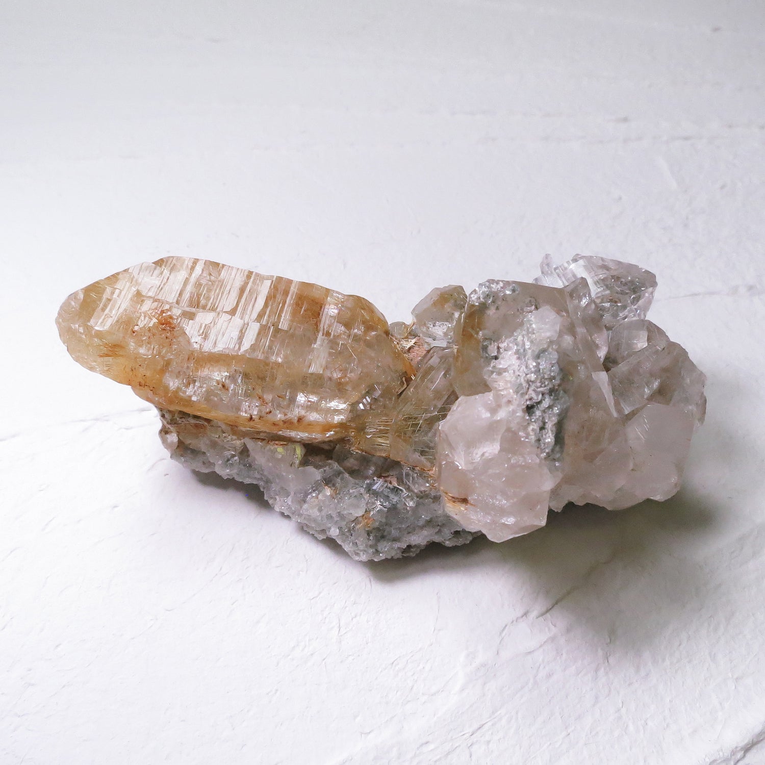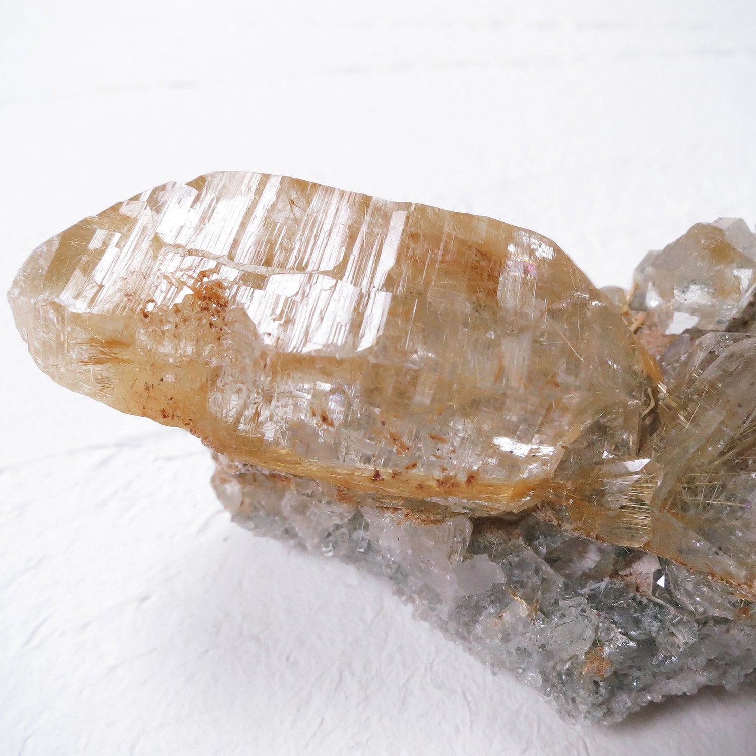 ヘマタイトから太陽光のように伸びた金針が映えるのは水晶の透明度による照りの良さがあるからです。内包物にも大変珍しいものが含まれています。