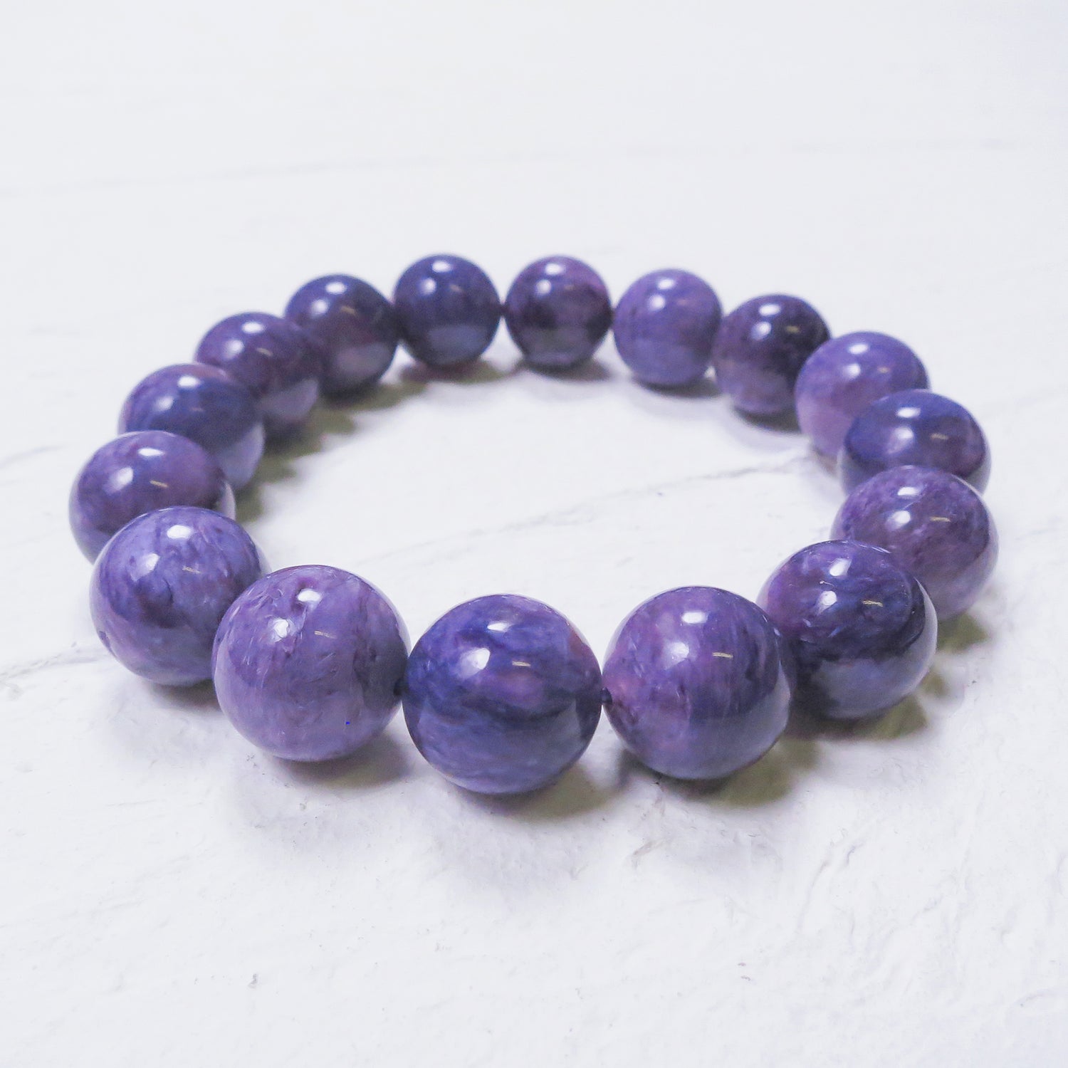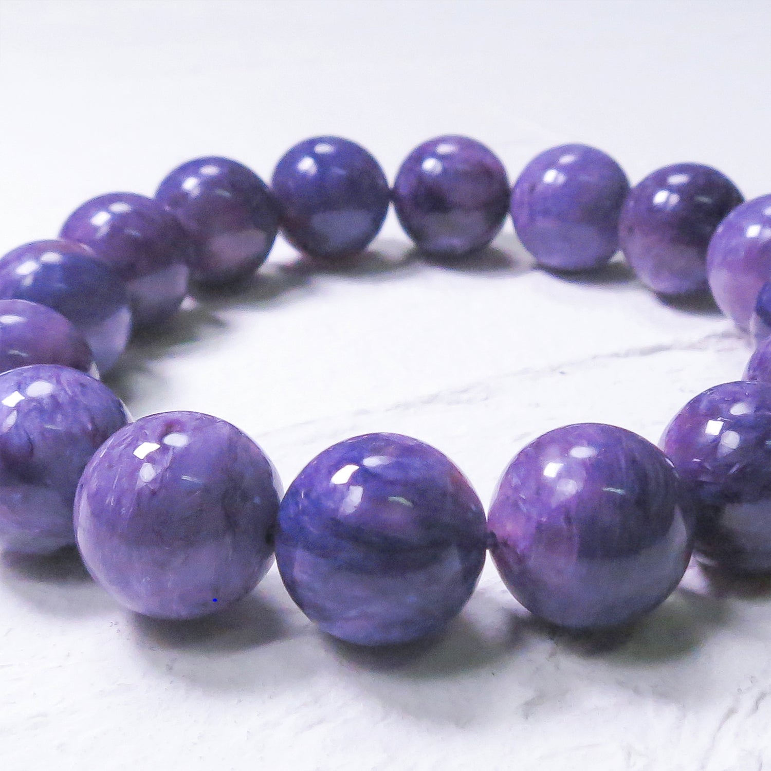 産地が紛争当事国であり流通が細くなりつつある中、こちらは滅多に見られない色味が均質な13mmアップのチャロアイトをご用意いたしました。