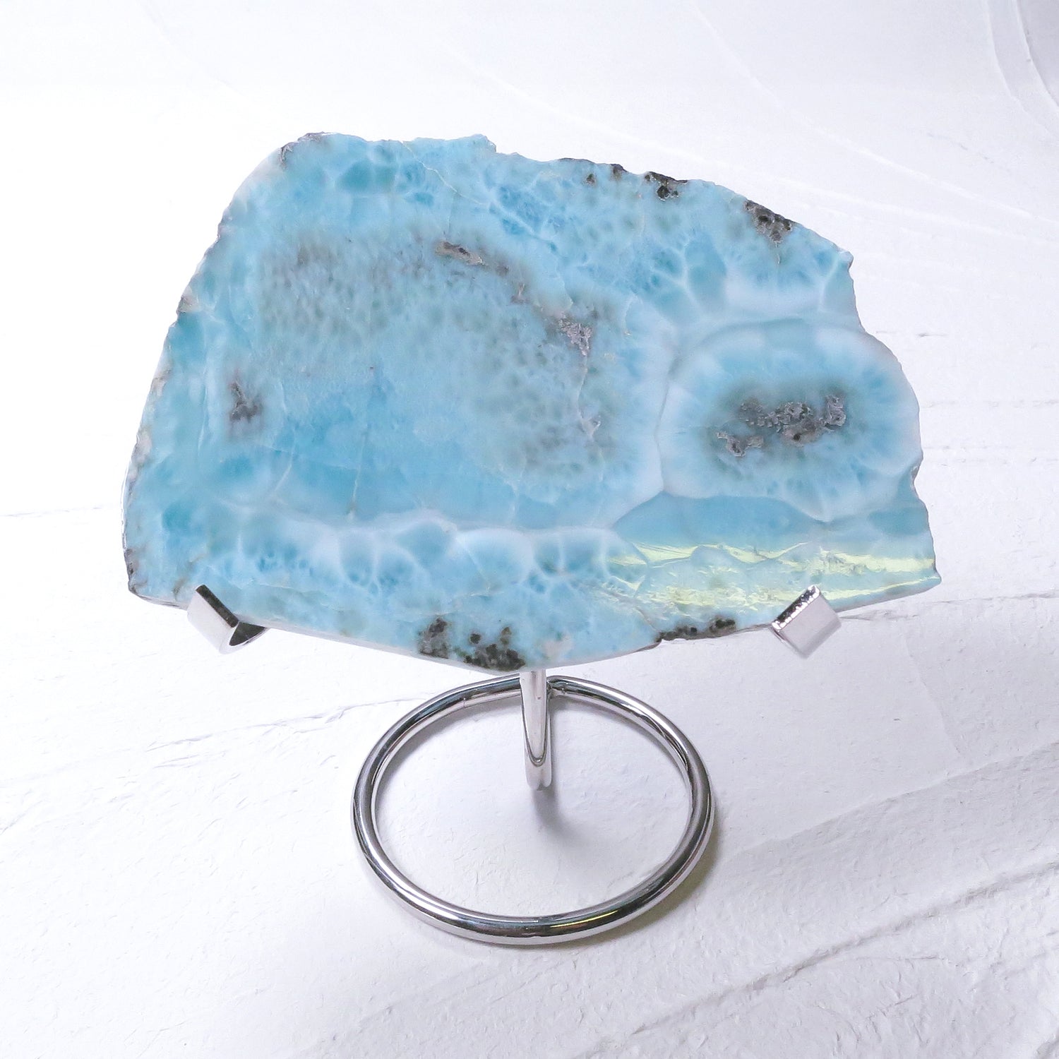 こちらも美しいナチュラルラリマースライス。敷物として大玉のブレス1本が丸ごと置けるサイズ感かつ台座付きで置物としても存在感を発揮できます。