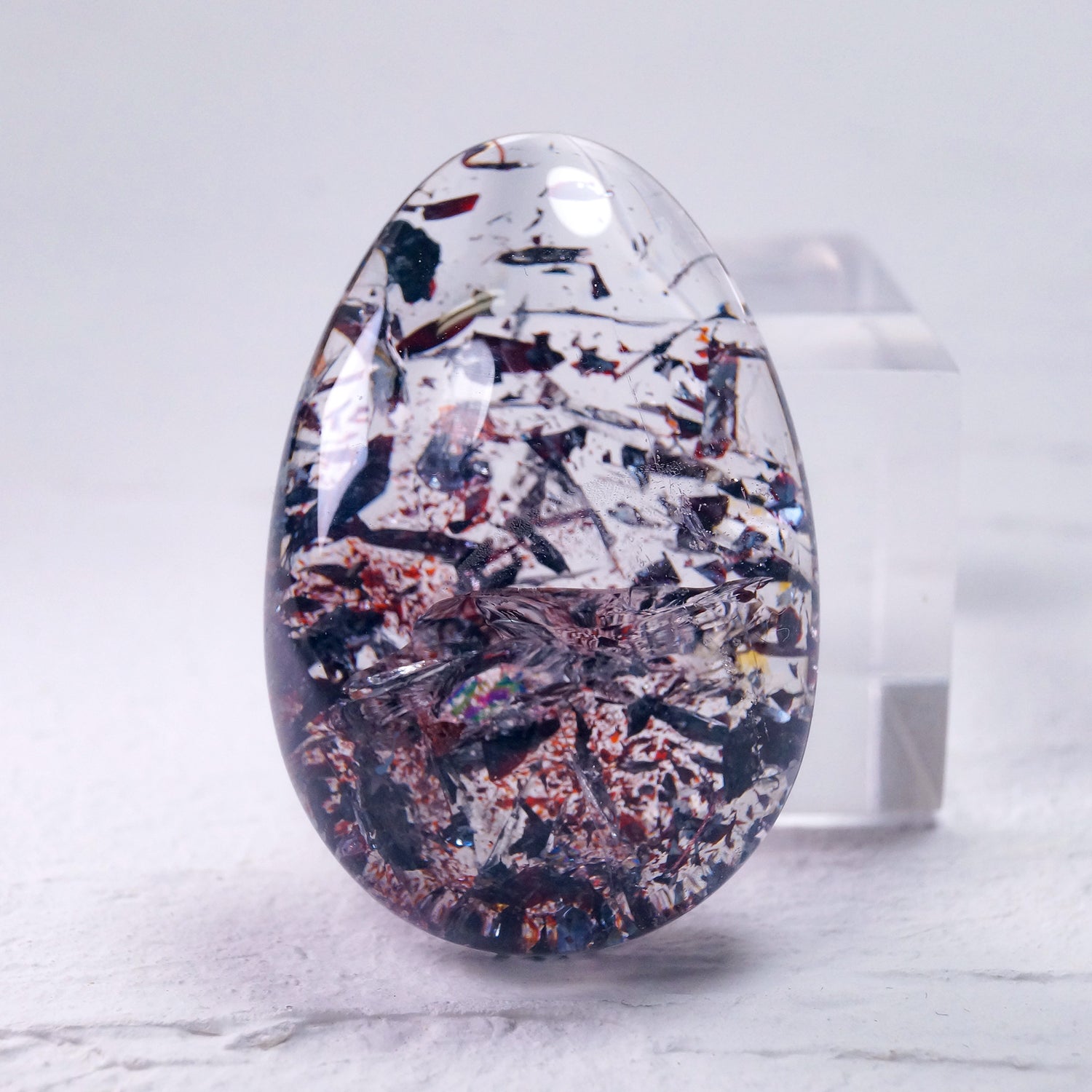 透明感のある245カラットにレピドクロサイト・ヘマタイトが片状の層となっています。ペアシェイプ下部に天然アイリスの虹が広がっています。