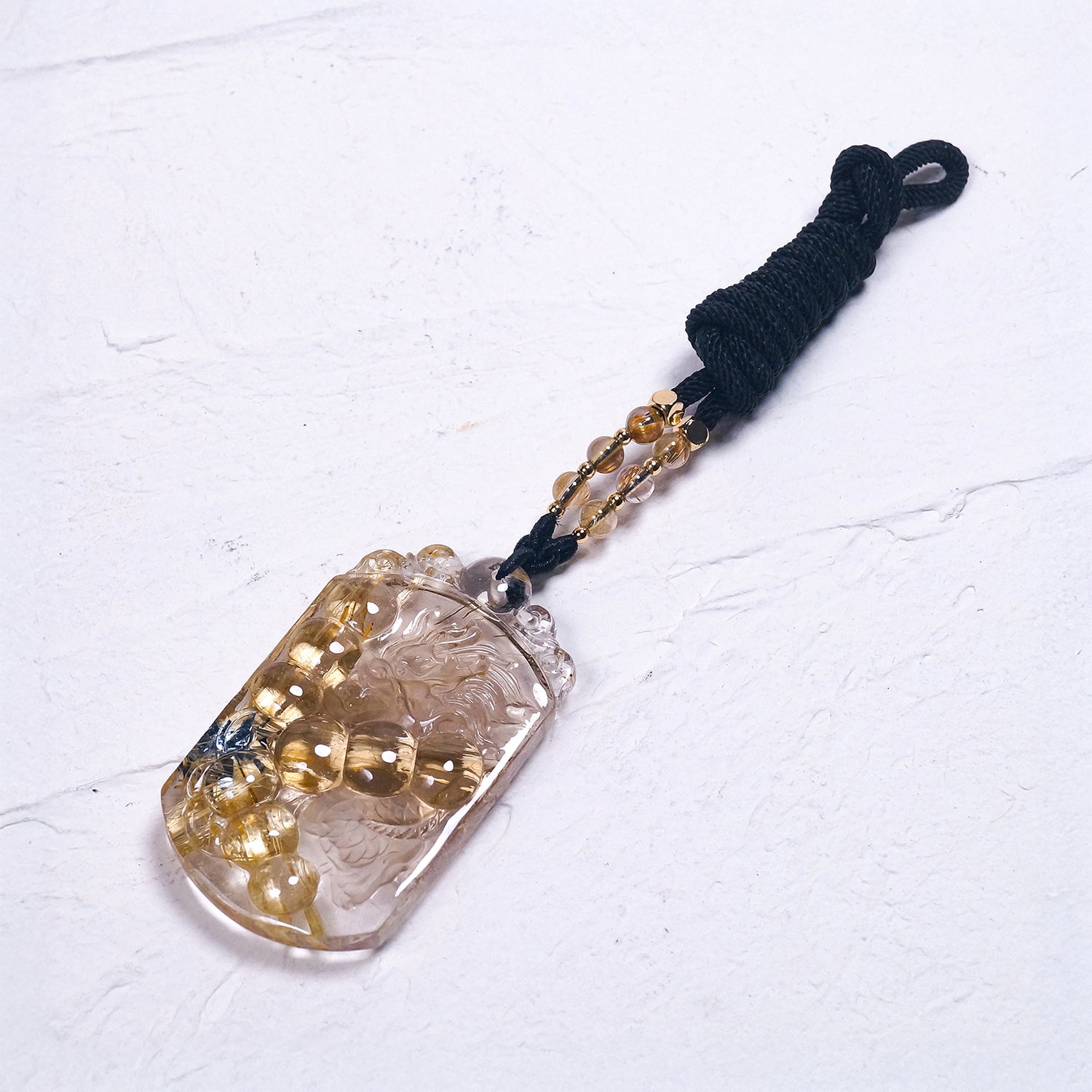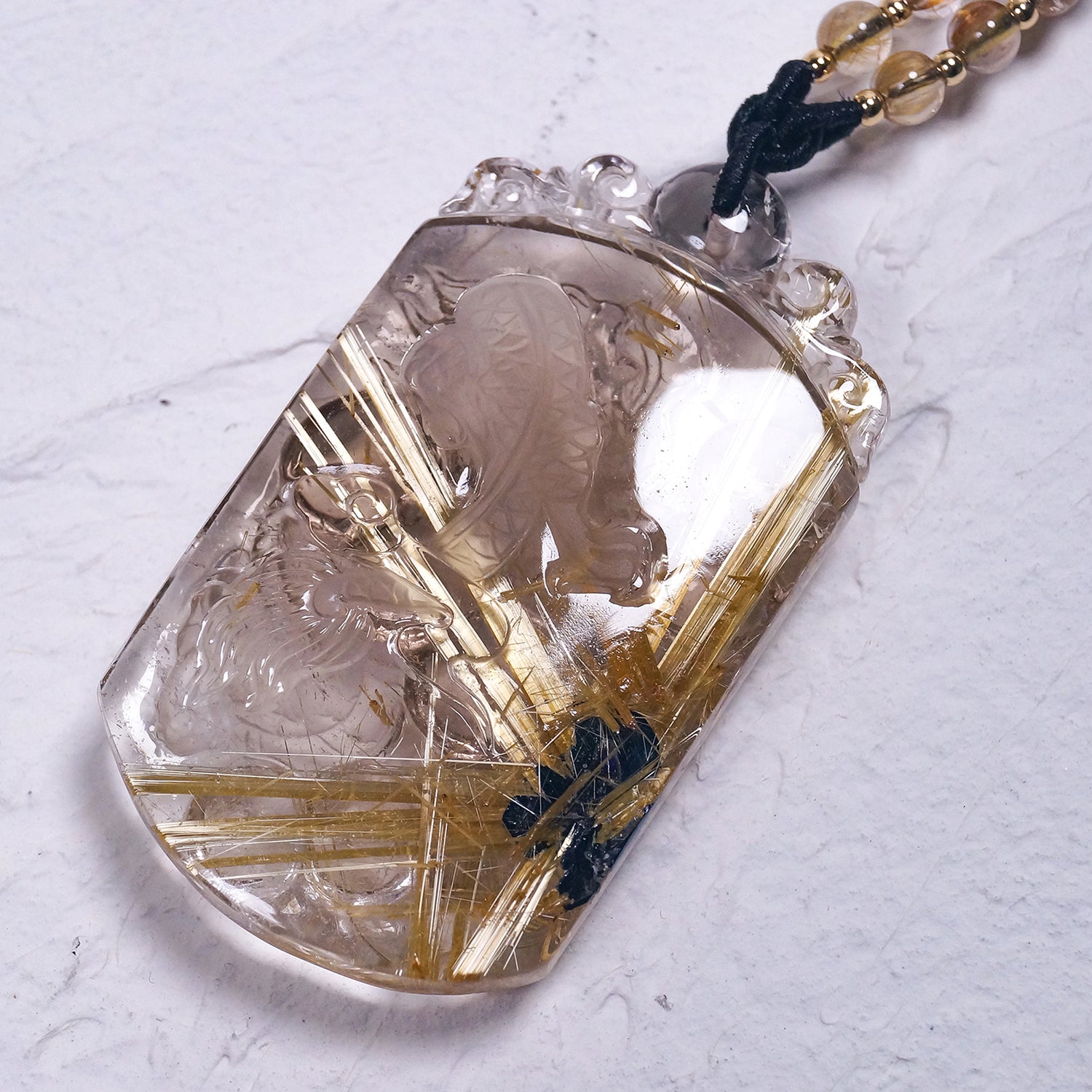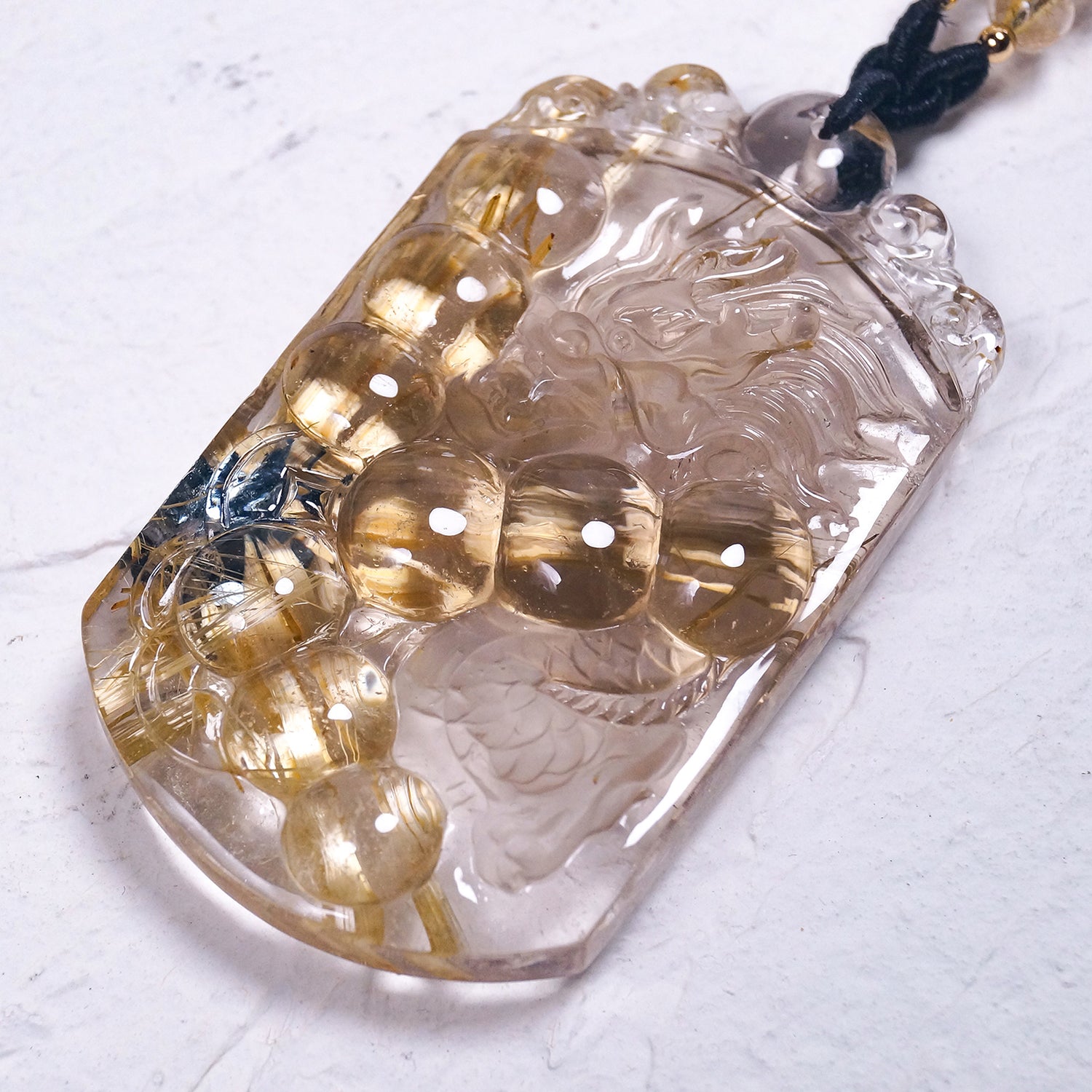 透明感のある水晶に内包された太陽放射ルチルの金針が映え、それに向かう昇龍が成長・成功へと導きます。