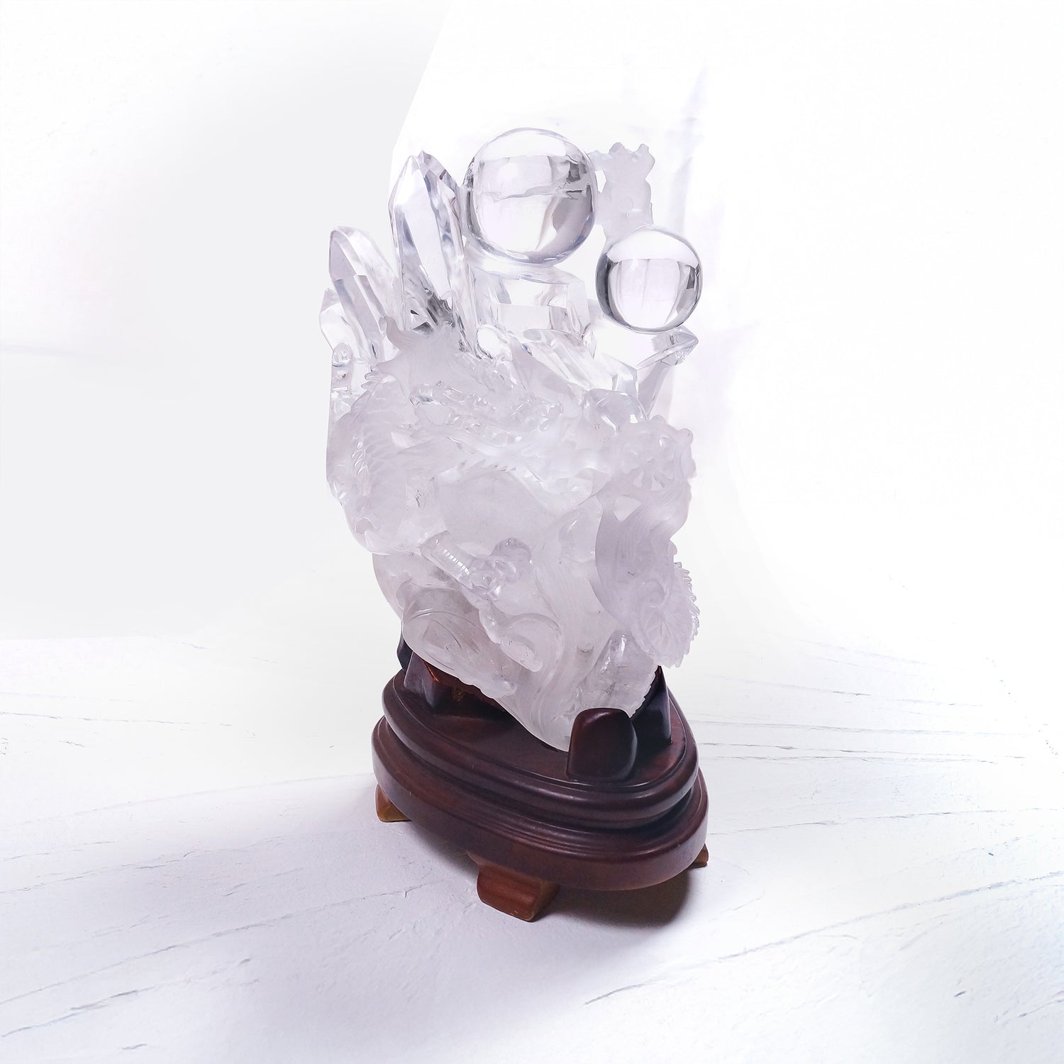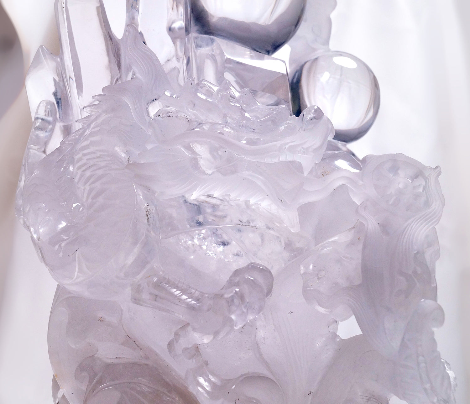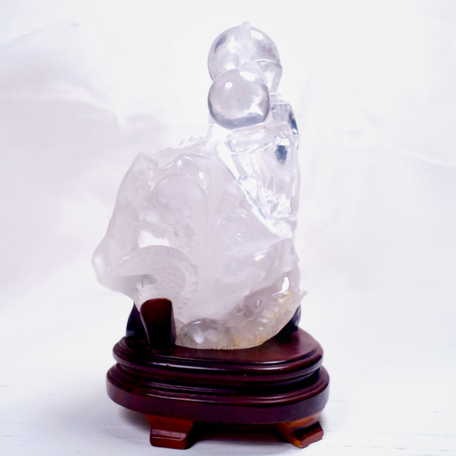 このサイズ感で上部のポイント・玉はほぼ無色・透明で神聖な印象。一原石から鱗の1枚まで丁寧に彫られた龍が運を切り開く迫力の名品です。