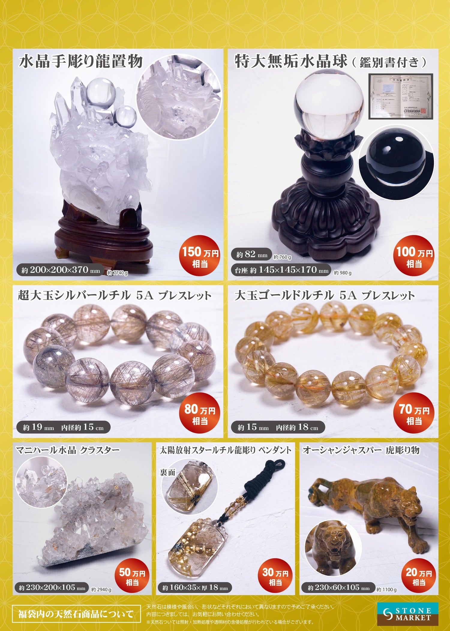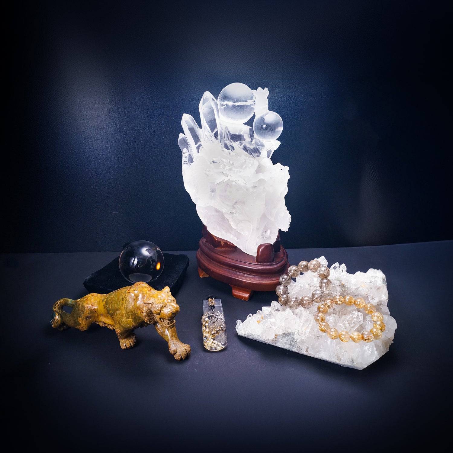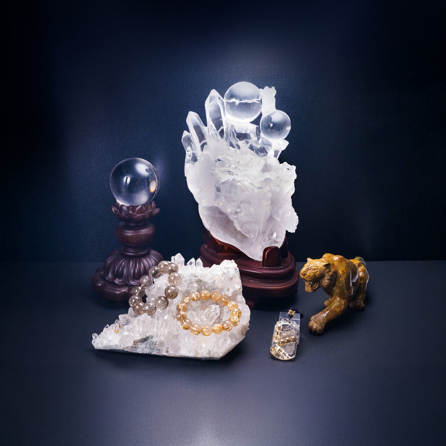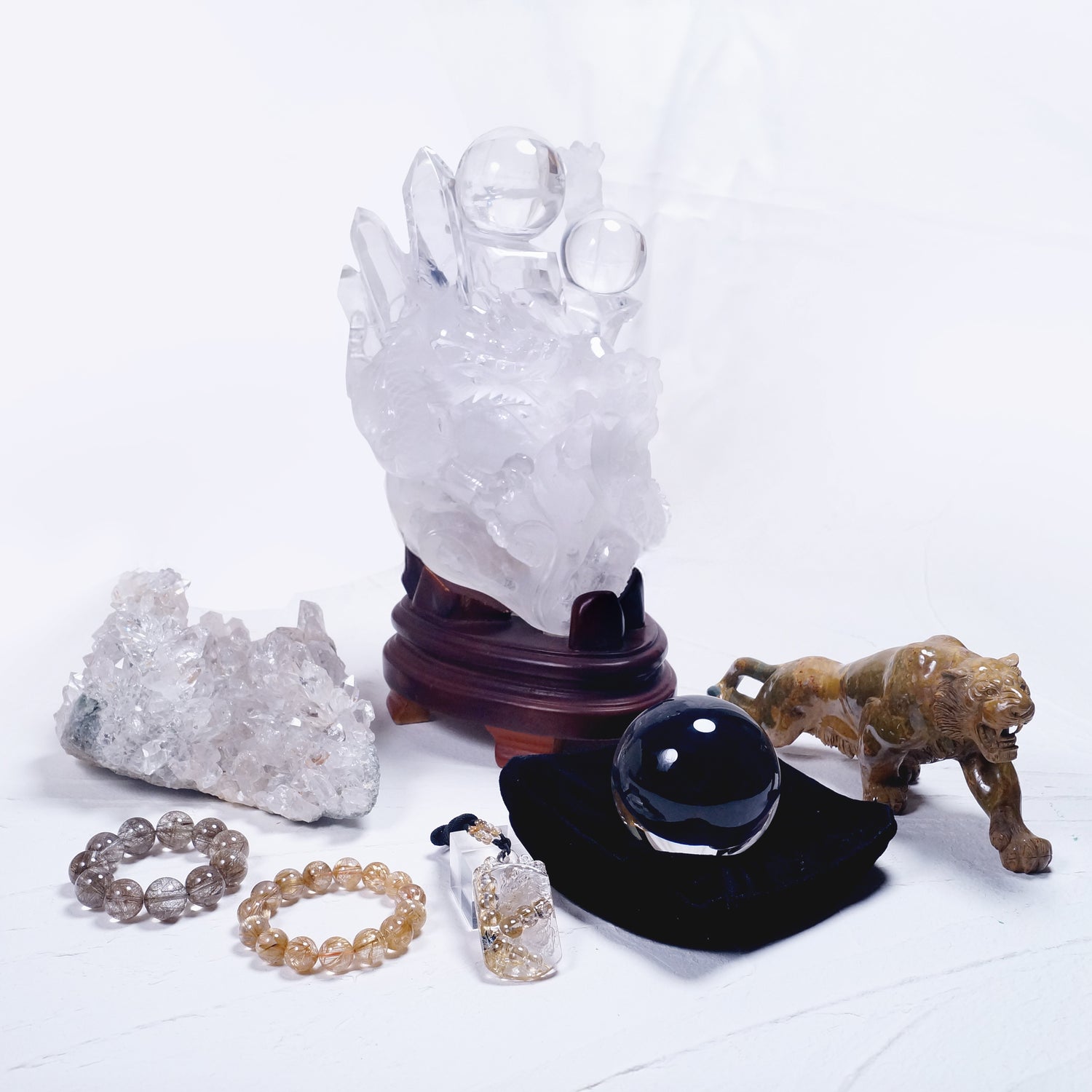 古来より風水では強運をつかみ取る龍と厄を払う虎は最高に縁起の良い組み合わせとして尊ばれています。災いをなす悪しきものはすべて無垢の力により浄化し、健康と金銀が家内に満ち溢れるという願いを込めて最上級の水晶等を集めました。