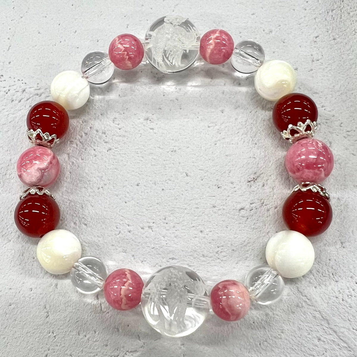 素材 ブレス内径 約17cm, 朱雀彫水晶(彫・天然石)約14mm, インカローズ(天然石)約8mm・約10mm, カーネリアン(着色天然石)約10mm, 水晶(天然石)約8mm, マザーオブパール(模造石)約10mm, メッキパーツ